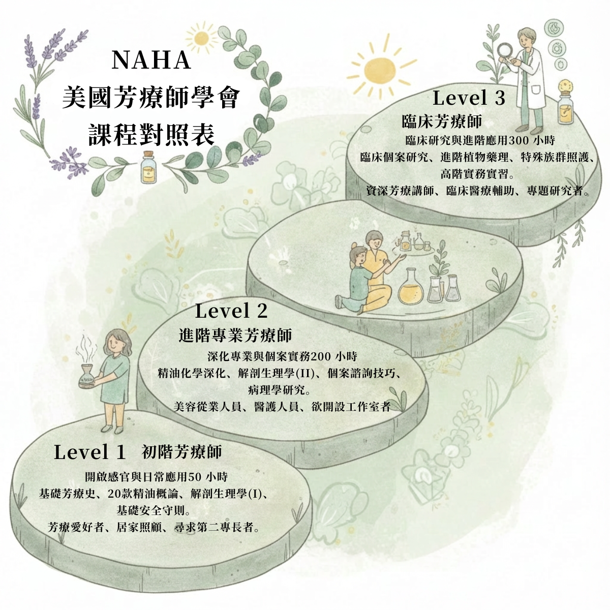 美國國家整體芳療師協會(National Association for Holistic Aromatherapy, NAHA)成立於 1990 年,為全球最具規模且最具代表性的非營利芳療組織。我們致力於推動高品質的植物科學研究,並制定嚴謹的教育培訓標準。NAHA 的證照體系被視為國際芳療界的權威標竿,透過專業的階梯式學習架構(Level 1:50 小時、Level 2:200 小時、Level 3:300 小時),由淺入深地帶領學員穩扎穩打,開啟通往芳香療癒的專業之路。
